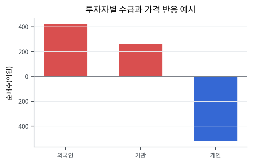 주체별 순매수 방향을 단순화한 예시다. 실제 해석에서는 막대의 절대 크기보다 가격이 이 수급 방향에 어떻게 반응했는지를 함께 봐야 의미가 커진다.