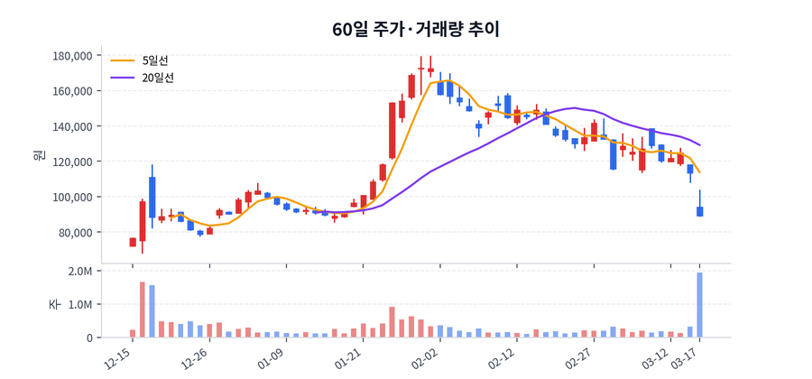 당일 기준 종가는 89,200원, 등락률은 -21.41%, 거래량은 1,943,608주, 거래대금은 1,850억원 수준으로 마감했다.