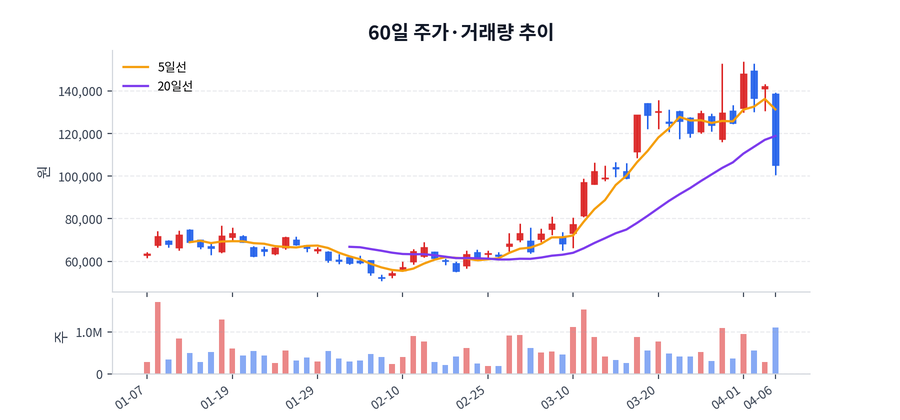 당일 기준 종가는 105,100원, 등락률은 -25.99%, 거래량은 1,097,097주, 거래대금은 1,253억원 수준으로 마감했다.