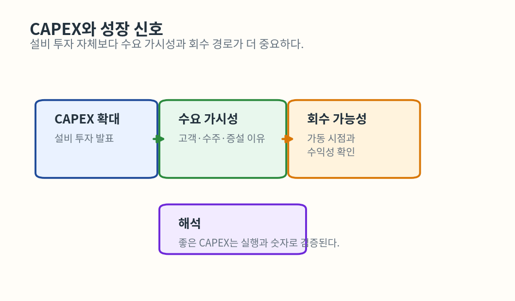 CAPEX는 미래를 보여 주는 신호일 수 있지만, 언제나 수요 가시성, 회수 가능성, 자금조달 부담이라는 번역 과정을 거쳐야 한다. 좋은 CAPEX는 성장 스토리를 더 강하게 만들고, 나쁜 CAPEX는 숫자가 좋아 보여도 부담을 남긴다.