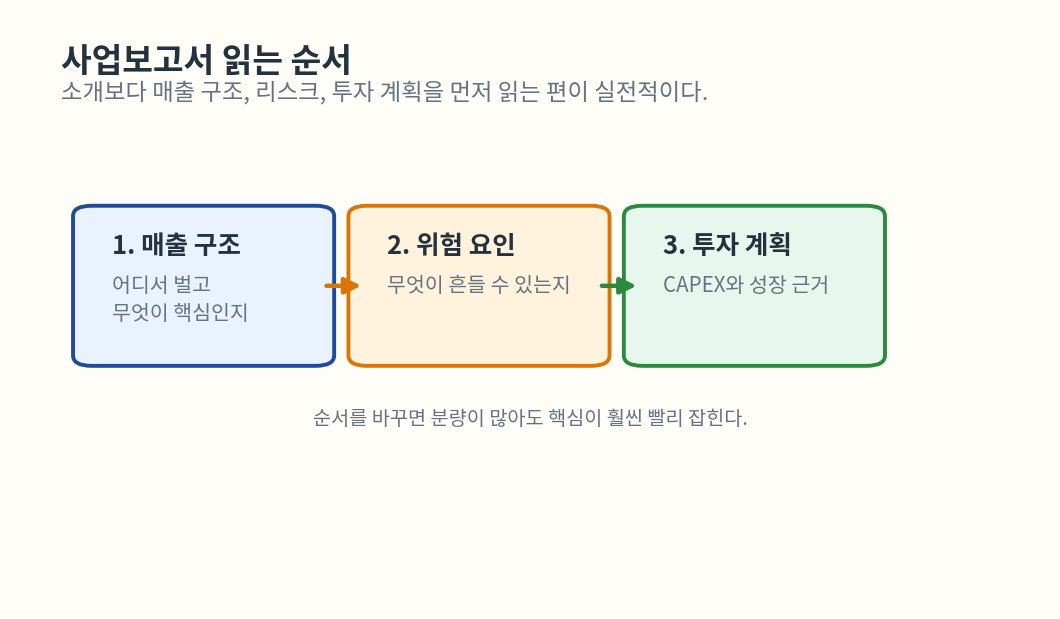 사업보고서는 많이 읽는 것보다 무엇을 먼저 읽는가가 중요하다. 가장 실전적인 순서는 사업 개요와 매출 구조, 위험 요인, 투자 계획, 재무 확인이다.