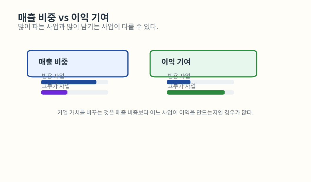 매출이 큰 사업과 이익을 만드는 사업이 다를 수 있다는 점이 사업 구조 해석의 핵심이다.