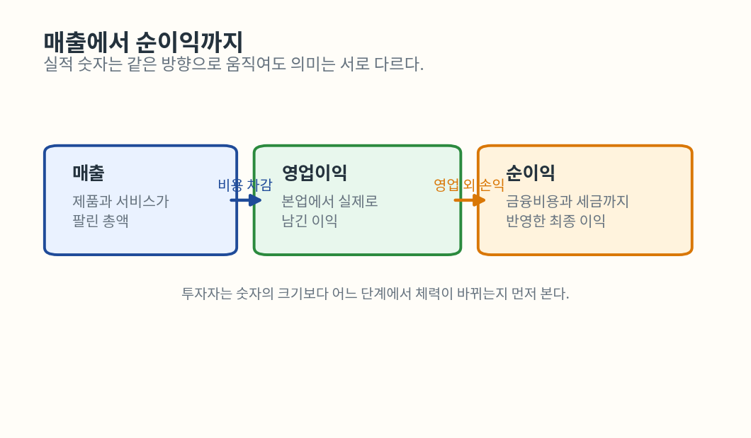 매출에서 영업이익, 순이익으로 갈수록 투자자가 확인해야 할 해석 포인트가 더 많아진다.