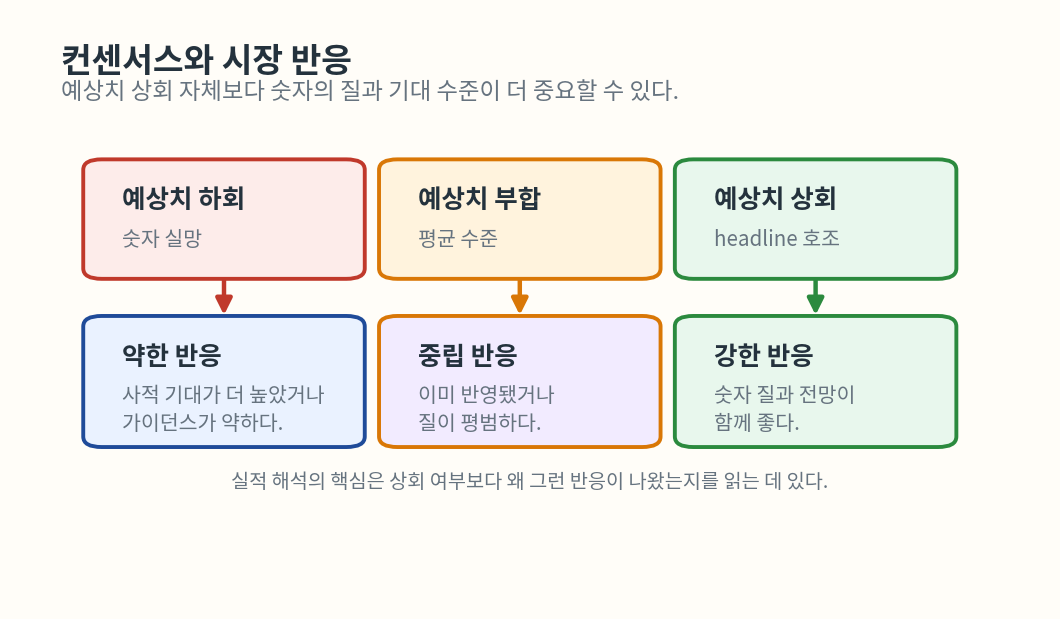 컨센서스 상회는 출발점일 뿐이다. 투자자가 실제로 확인해야 할 것은 어느 항목이 좋아졌는지, 그 개선이 반복 가능한지, 시장 가격이 그 숫자에 동의했는지다.