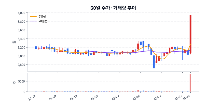 최근 가격 범위는 2,700원에서 3,945원 사이였고, 종가 기준 변동성이 적지 않았던 구간이다.