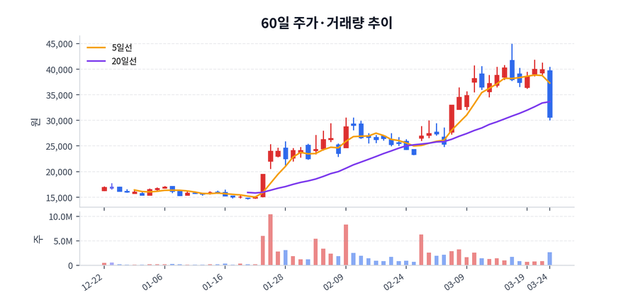 최근 가격 범위는 14,570원에서 45,000원 사이였고, 종가 기준 변동성이 적지 않았던 구간이다.