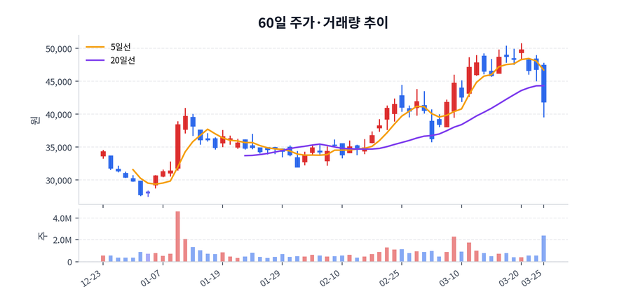 최근 가격 범위는 27,450원에서 50,800원 사이였고, 종가 기준 변동성이 적지 않았던 구간이다.