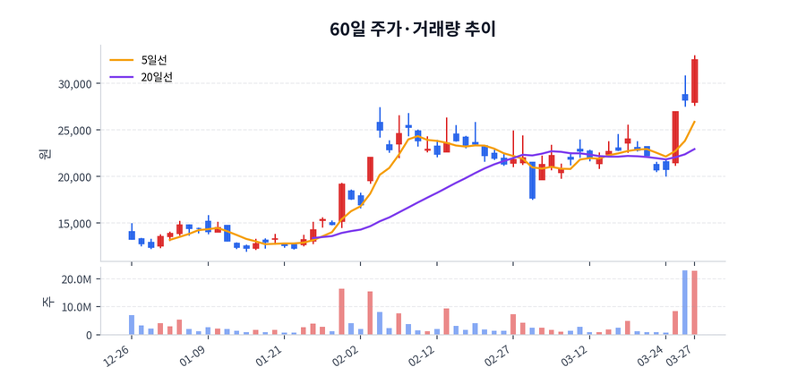 최근 가격 범위는 11,950원에서 33,050원 사이였고, 종가 기준 변동성이 적지 않았던 구간이다.