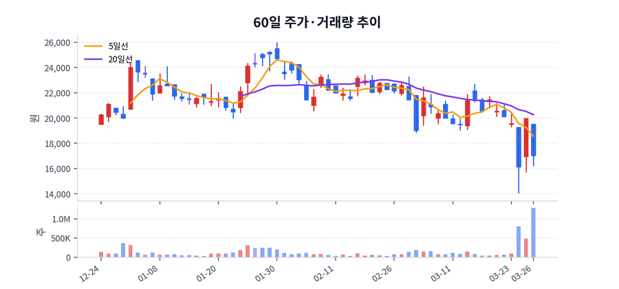 최근 가격 범위는 14,030원에서 26,000원 사이였고, 종가 기준 변동성이 적지 않았던 구간이다.