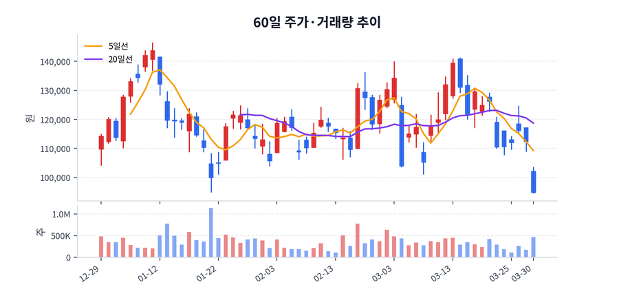 최근 가격 범위는 94,500원에서 146,600원 사이였고, 종가 기준 변동성이 적지 않았던 구간이다.
