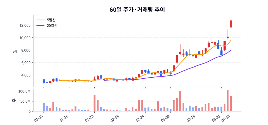 당일 기준 종가는 12,740원, 등락률은 +25.89%, 거래량은 75,787,389주, 거래대금은 9,404억원 수준으로 마감했다.