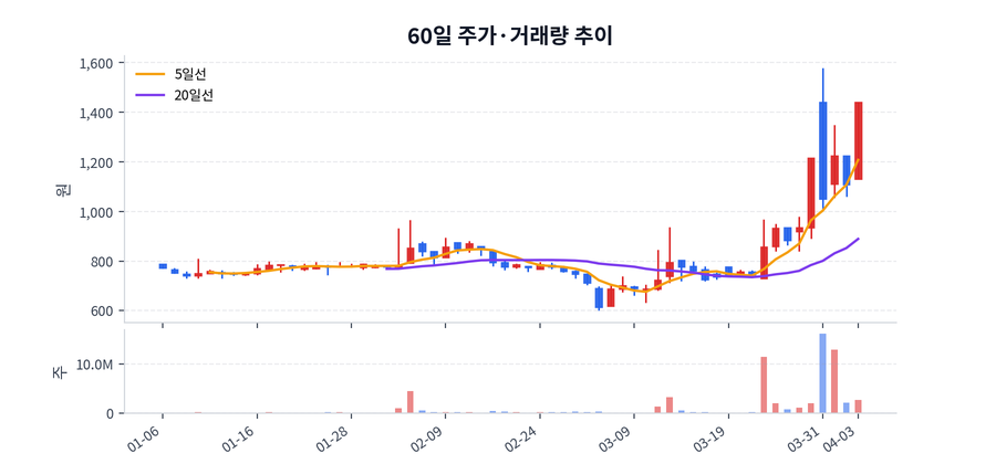 당일 기준 종가는 1,440원, 등락률은 +29.96%, 거래량은 2,608,840주, 거래대금은 36억원 수준으로 마감했다.