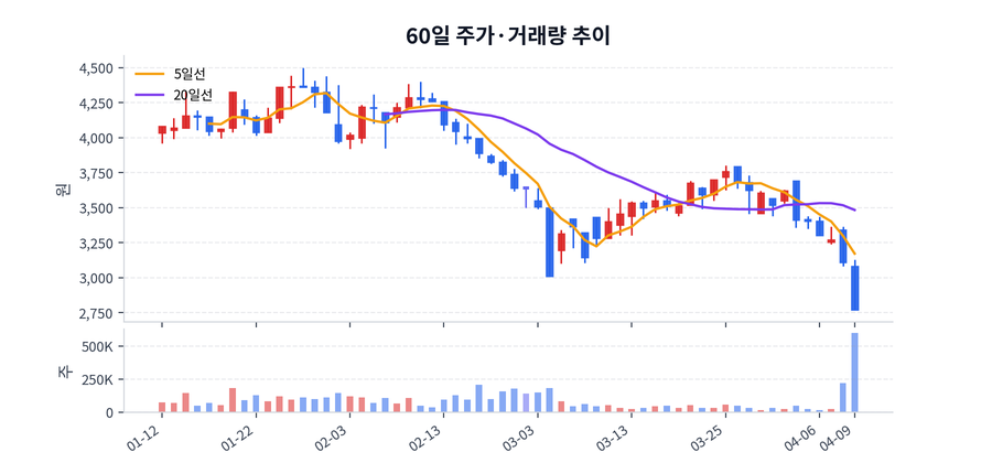 최근 가격 범위는 2,770원에서 4,500원 사이였고, 종가 기준 변동성이 적지 않았던 구간이다.