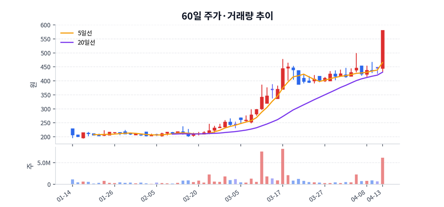 당일 기준 종가는 581원, 등락률은 +29.98%, 거래량은 6,089,924주, 거래대금은 32억원 수준으로 마감했다.