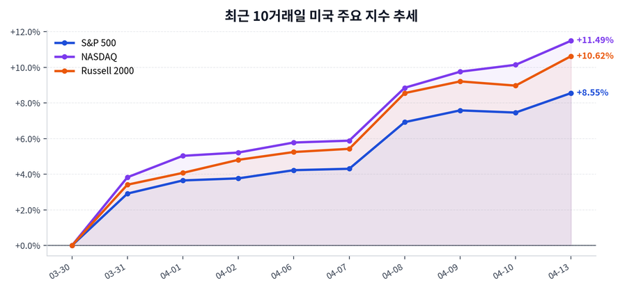 S&P 500 기준 최근 10거래일 누적 수익률은 +8.55%로 상승 흐름이었다. NASDAQ 기준 최근 10거래일 누적 수익률은 +11.49%로 상승 흐름이었다.