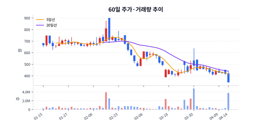 당일 기준 종가는 346원, 등락률은 -17.81%, 거래량은 3,784,959주, 거래대금은 14억원 수준으로 마감했다.