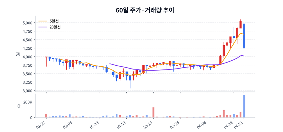 최근 가격 범위는 3,065원에서 5,100원 사이였고, 종가 기준 변동성이 적지 않았던 구간이다.