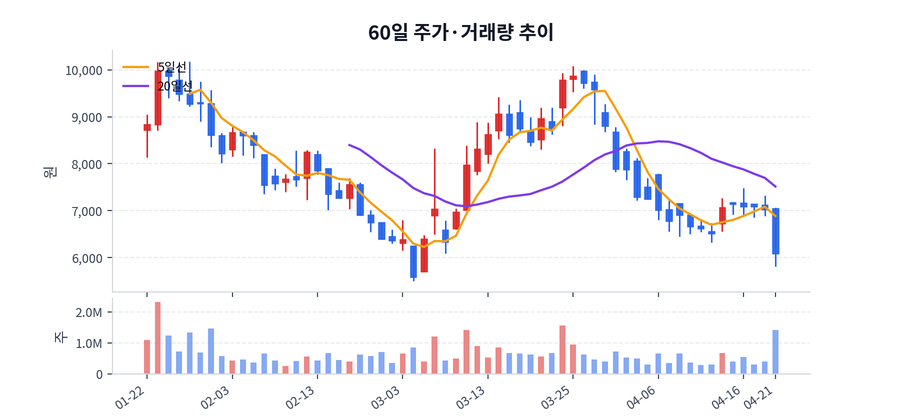 최근 가격 범위는 5,500원에서 10,180원 사이였고, 종가 기준 변동성이 적지 않았던 구간이다.