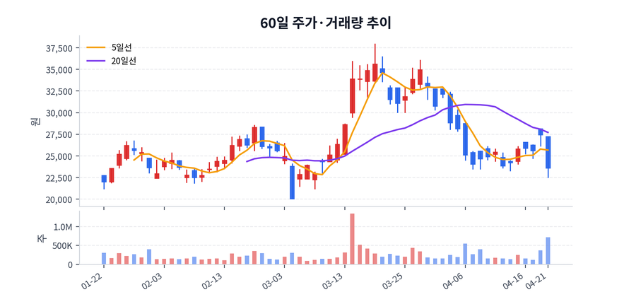 최근 가격 범위는 20,050원에서 38,000원 사이였고, 종가 기준 변동성이 적지 않았던 구간이다.