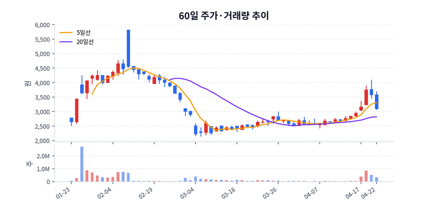 최근 가격 범위는 2,140원에서 5,820원 사이였고, 종가 기준 변동성이 적지 않았던 구간이다.
