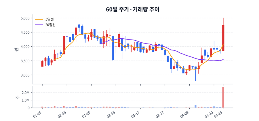 당일 기준 종가는 4,745원, 등락률은 +23.09%, 거래량은 2,731,313주, 거래대금은 132억원 수준으로 마감했다.