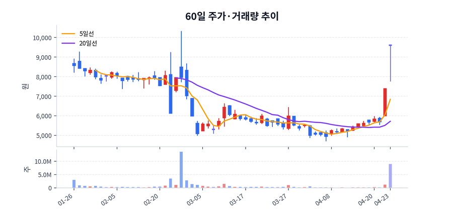 최근 가격 범위는 4,700원에서 10,340원 사이였고, 종가 기준 변동성이 적지 않았던 구간이다.