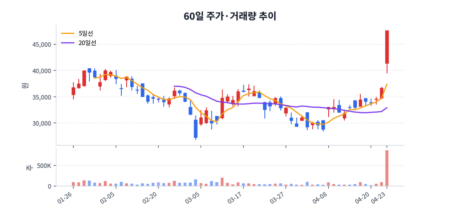 최근 가격 범위는 26,800원에서 47,600원 사이였고, 종가 기준 변동성이 적지 않았던 구간이다.