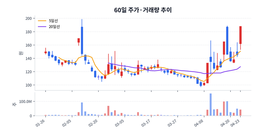 당일 기준 종가는 188원, 등락률은 +29.66%, 거래량은 42,715,919주, 거래대금은 75억원 수준으로 마감했다.